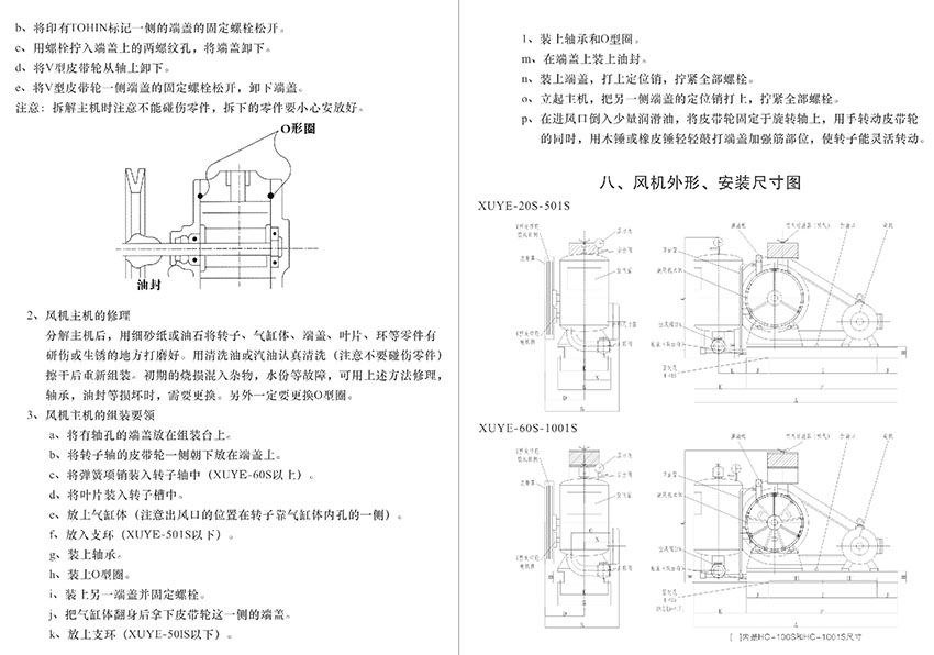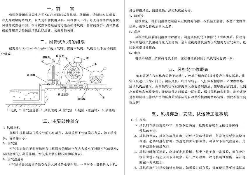 2、HF回轉(zhuǎn)式鼓風機結(jié)構(gòu)精巧,主要由電機、空氣過濾器、鼓風機本體、空氣室、底座(兼油箱)、滴油嘴六個部分組成。
